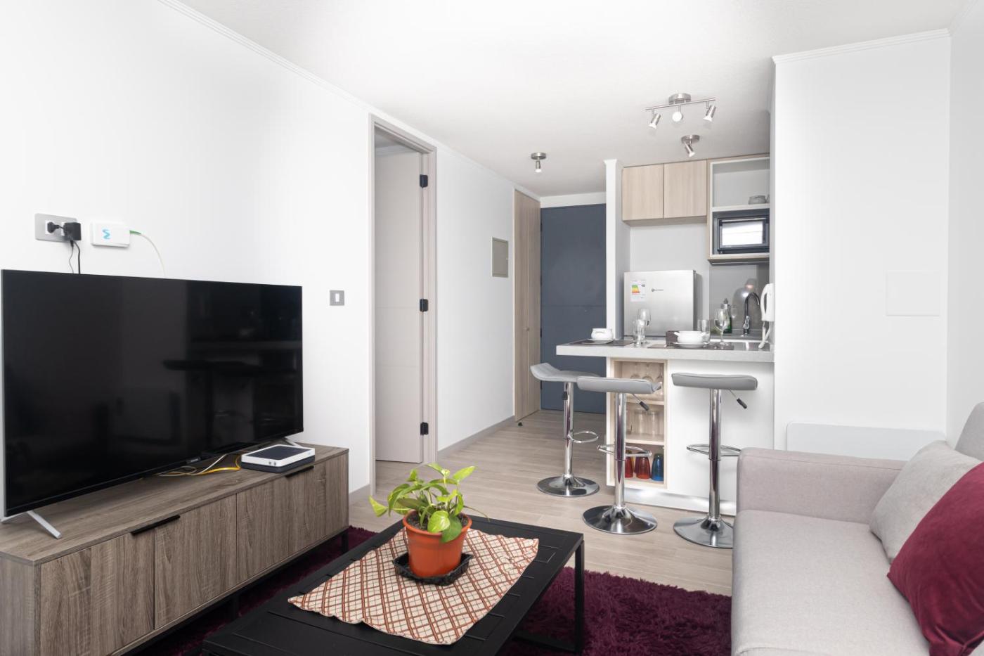 The apartment is composed of 1 bedroom, a fully equipped kitchen, and 1 bathroom. A flat-screen TV is featured.